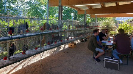 Für die Züchter war es eine tolle Möglichkeit ihren Zuchtstand aus der Sicht eines Preisrichters bzw. Anwärters begutachten zu lassen. Eine Win/Win Situation. Die drei Schulungsleiter Uwe Maurer für Groß und Wassergeflügel, Hühner und Zwerghühner, Franz Olaf Singer für das Ziergeflügel und Michael Barbeito für die Tauben, standen mit Rat und Tat zur Seite. Nach einem deftigen Weißwurstfrühstück schritten wir zur Tat und konnten prima Besprechungen der Anwärter verfolgen, bei der die Züchter nicht zu kurz kamen und auch ihre Sicht darlegten.