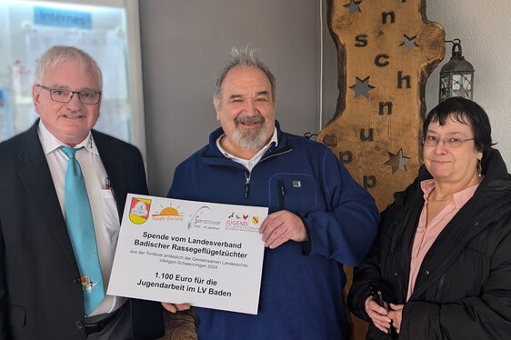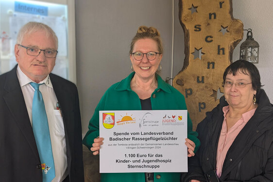 Zur gemeinsamen Landesschau der Rassegeflügelzüchter am 19. und 20.10.2024 in Villingen-Schwenningen hatte Gabi Weisser eine riesengroße Tombola vorbereitet und bestens präsentiert. Viele Privatpersonen, Vereine und Unternehmen hatten diese durch Geld- und Sachspenden unterstützt. Die große Mühe hat sich gelohnt. Von den 2.200, - Euro Gesamterlös konnten am 05.12.2024 von Gabi und Walter Weisser an die Kinder Jugendhospitz Sternschnuppe in VS-Schwenningen jeweils 1.100, - € an Frau Michaela Morath von der Kinder- und Jugendhospitz Sternschnuppe Schwarzwald-Baar-Kreis und der gleiche Betrag an Landesjugendleiter Herr Günter Endres für die Jugendabteilung der Badischen Rassegeflügelzüchter überreicht werden. Beide Empfänger bedanken sich bei den Organisatoren, Spender und Tombola Teilnehmer ganz herzlich für die Unterstützung.